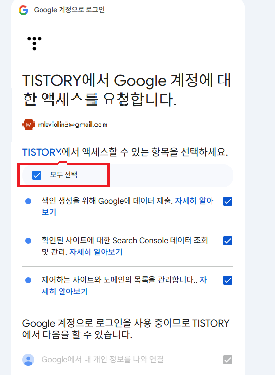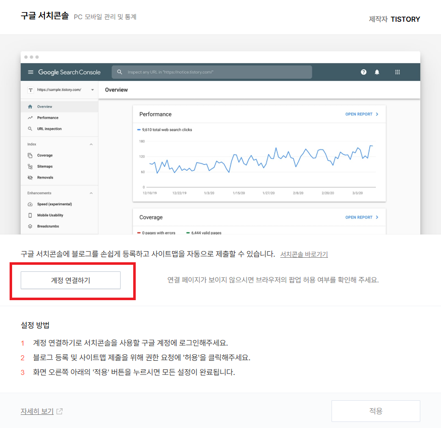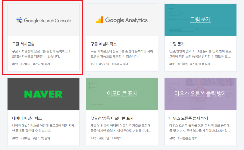 이후 여러가지 카테고리 중에 구글 서치콘솔을 클릭해주고 계정 연결하기 클릭!
