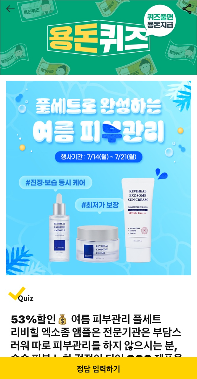 53%할인 여름 피부관리 풀세트 리비힐 엑소좀 앰플에는 고도의 생산기술로 순도와 안정성을 높인 OO엑소좀, 신선한 목장 우유에서 특허된 공정으로 추출한 우유엑소좀이 들어 있습니다. OO은 무엇일까요? (초성: ㅂㅍ)