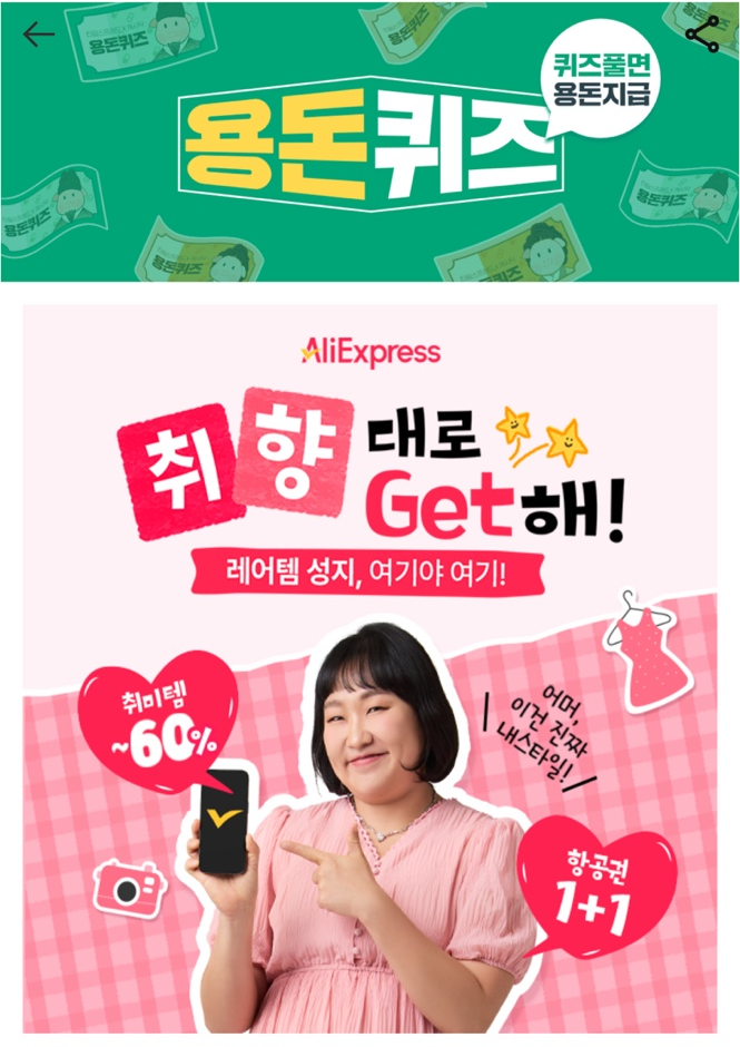 앱을 통해 퀴즈를 맞추면 포인트를 주는 캐시닥 오늘의 용돈 퀴즈입니다. 취향을 찾아 다양한 아이템을 구입할 수 있는 알리 익스프레스에서, 퀴즈와 함께 고객들에게 상품도 드리는 찬스! 알리 익스프레스 문제를 2개 가져왔어요~!