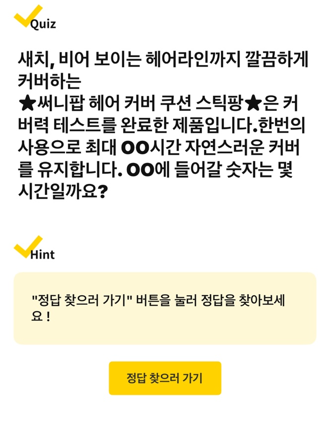 새치, 비어 보이는 헤어라인까지 깔끔하게 커버하는 ★써니팝 헤어 커버 쿠션 스틱팡 ★은 커버력 테스트를 완료한 제품입니다. 한번의 사용으로 최대 OO 시간 자연스러운 커버를 유지합니다. OO에 들어갈 숫자는 몇시간일까요?