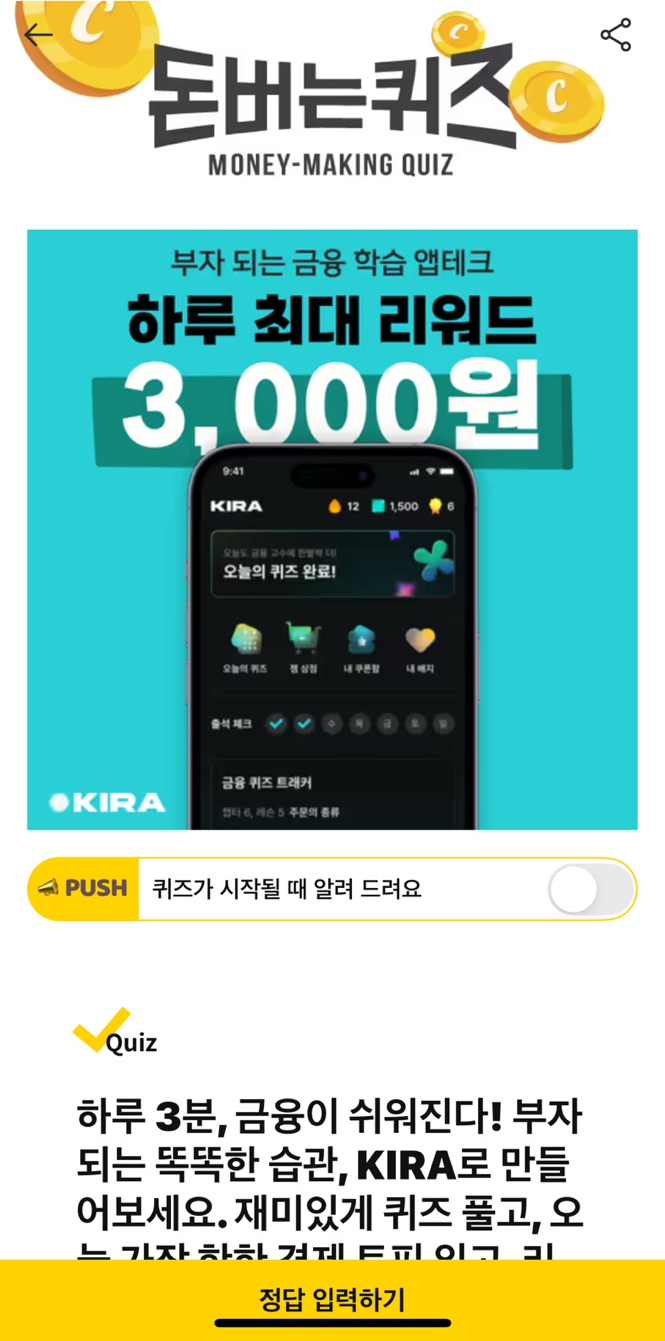 하루 3분 금융이 쉬워진다! 부자되는 똑똑한 습관, KIRA로 만들어보세요. 재미있게 퀴즈 풀고, 오늘 가장 핫한 경제 토픽 읽고, 리워드로 현금 상품권 교환까지!
