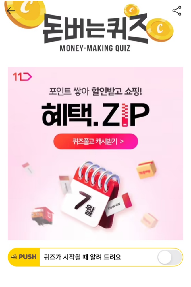 11번가 캐시워크 돈버는퀴즈입니다. 11번가가 통 크게~ 준비한 원데이빅딜부터 찐템페스타까지 OO하고 초특가 쇼핑! 지금 쇼핑 일정 캘린더에 OO해볼까요? 놓치면 후회해요!
