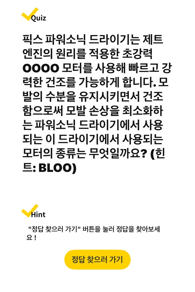 픽스 파워소닉 드라이기는 제트엔진의 원리를 적용한 초강력 OOOO모터를 사용해 빠르고 강력한 건조를 가능하게 합니다. 모발의 수분을 유지시키면서 건조함으로써 모발 손상을 최소화하는 파워소닉 드라이기에서 사용되는 이 드라이기에서 사용되는 모터의 종류는 무엇일까요? (힌트 BLOO)