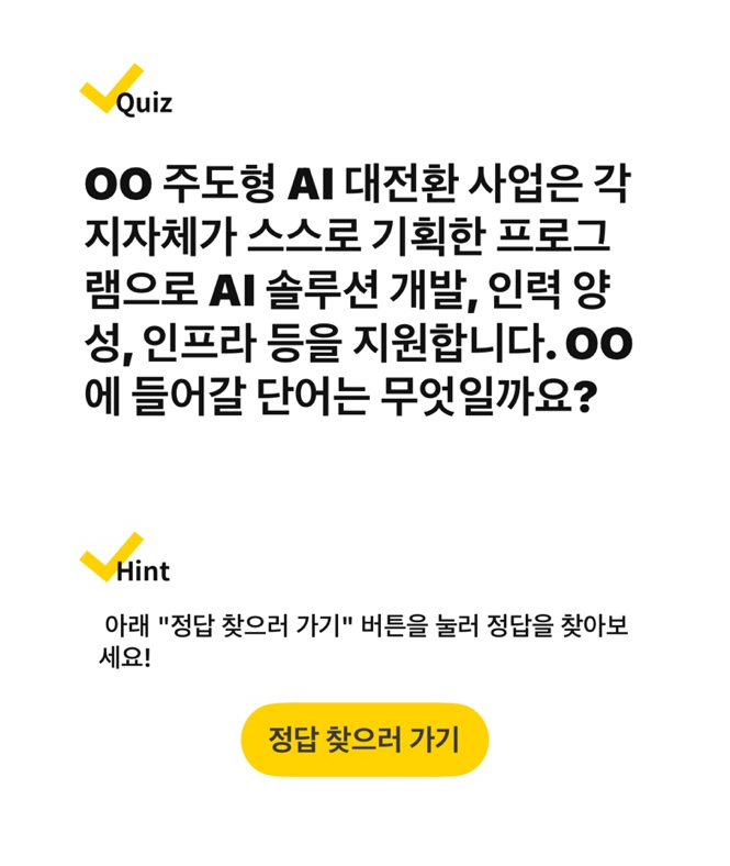 OO 주도형 AI 대전환 사업은 각지차제가 스스로 기획한 프로그램으로 AI 솔루션 개발, 인력 양성, 인프라 등을 지원합니다. OO에 들어갈 단어는 무엇일까요?