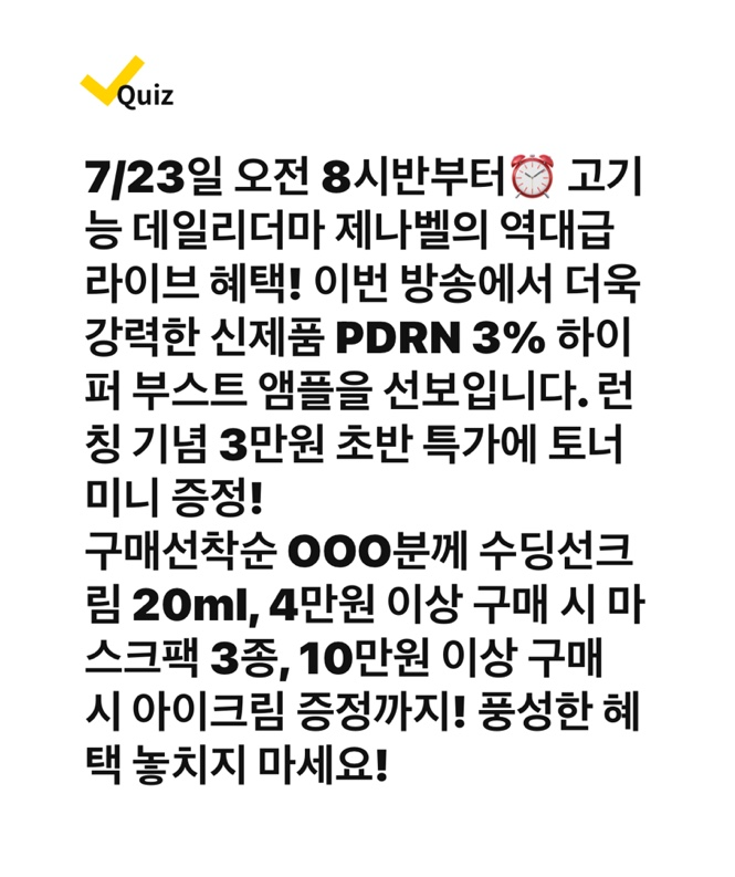 7/23일 오전 8시반부터 고기능 데일리더마 제나벨의 역대급 라이브 혜택! 이번 방송에서 더욱 강력한 신제품 PDRN 3% 하이퍼 부스트 앰플을 선보입니다. 런칭 기념 3만원 초반 특가에 토너미니 증정!