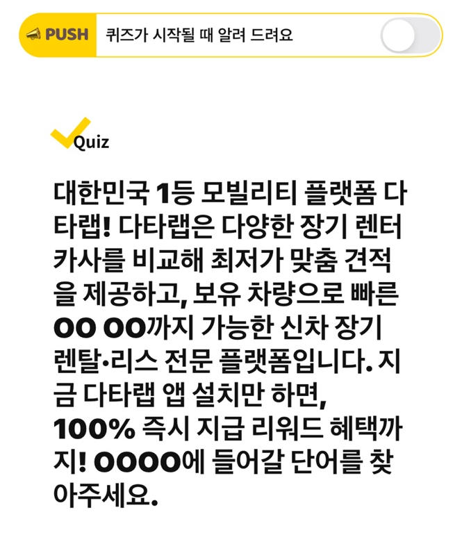 대한민국 1등 모빌리티 플랫폼 다타랩! 다타랩은 다양한 장기 렌터카사를 비교해 최저가 맞춤 견적을 제공하고, 보유 차량으로 빠른 OOOO까지 가능한 신차 장기 렌탈, 리스 전문 플랫폼입니다. 지금 다타랩 앱 설치만 하면, 100% 즉시 지급 리워드 혜택까지!