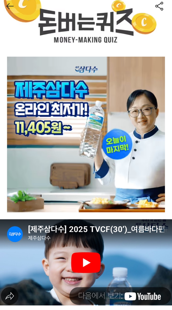 캐시워크 돈버는퀴즈(제주 삼다수)