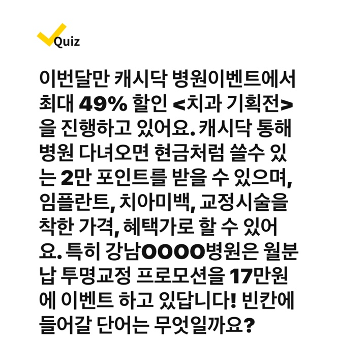 이번달만 캐시닥 병원이벤트에서 최대 49% 할인 <치과 기획전>을 진행하고 있어요. 캐시닥 통해 병원 다녀오면 현금처럼 쓸수 있는 2만 포인트를 받을 수 있으며, 임플란트, 치아미백, 교정시술을 착한 가격, 혜택가로 할 수 있어요. 특히 강남OOOO병원은 월분납 투명교정 프로모션을 17만원에 이벤트 하고 있답니다!