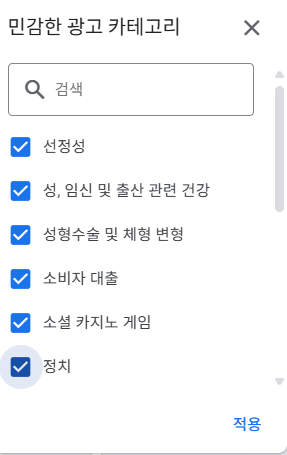 민감한 광고 안에는 아까 말했듯이, 선정성, 도박, 정치 등의 내용이 담겨있기 때문에 전부 클릭합니다.