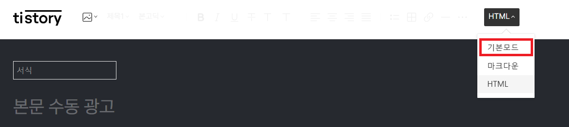 우측 상단에 [기본모드] -> [HTML] 로 변경한 뒤 아까 복사해두었던 코드를 삽입해줍니다.