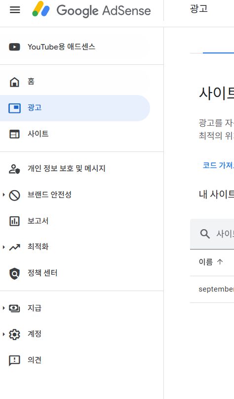 구글 애드센스에 들어가줍니다. 왼쪽 상단에 [광고] 클릭