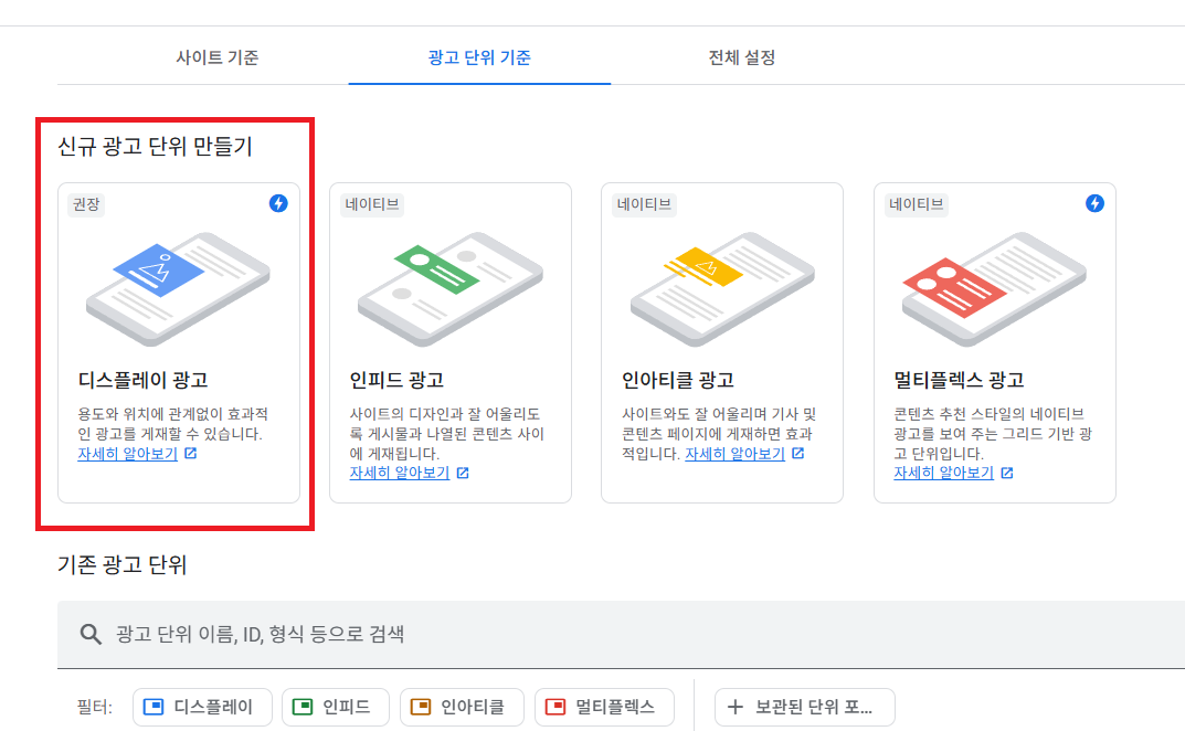 [광고]를 클릭했다면 [광고 단위 기준]을 선택하여 [디스플레이 광고]에 들어가줍니다.