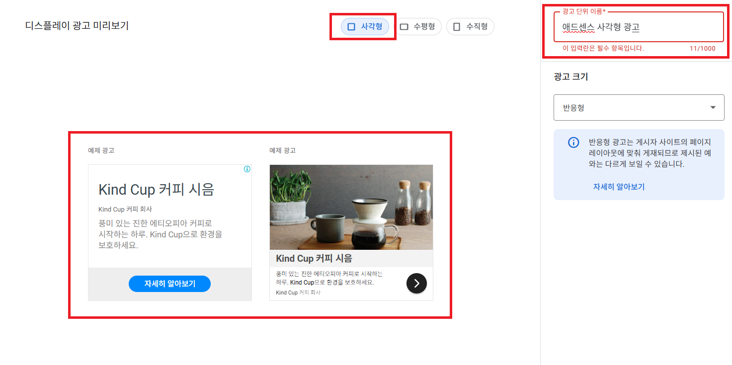 저는 사각 광고를 선택해보겠습니다. 그리고 광고 단위 이름은 아무거나 적어줍니다. 아래와같이 광고가 나오는 예시가 나올겁니다. 이렇게 광고를 삽입했을시 이런식으로 본문에 광고가 나오게 될 예정입니다.