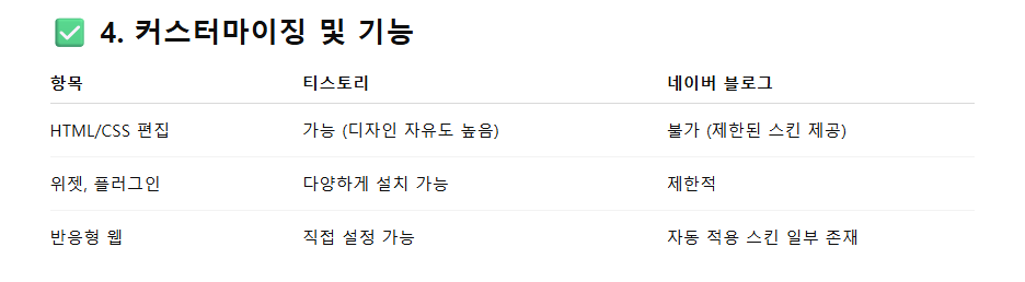 티스토리는 커스텀마이징이 가능하고 자유롭습니다. 그만큼 내가 원하는대로 블로그를 바꿀 수 있지만, 네이버는 다소 제한적입니다.