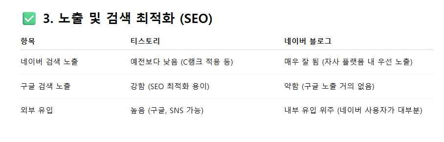 예전에 비해 조금 낮아진 티스토리 때문에 노출이 어렵습니다. 많은 분들이 여기에서 포기하곤 하죠. 노출이 낮기 때문에 끊임없이 올리다가 지치게 되는거죠, 대신 티스토리는 구글 검색이 강하기 때문에 구글에서 검색하는 사람들을 위한 콘텐츠를 많이 만드는게 중요합니다. 반면에 네이버 블로그는 오로지 네이버(내부) 중심의 검색 노출이 최적화 되었다고 생각할 수 있습니다.