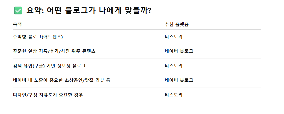 나에게 어떤 블로그 맞을까? 요약하자면 수익의 목적이라면 티스토리, 꾸준한 일상 기록을 원한다면 네이버 블로그를 하는게 좋습니다.