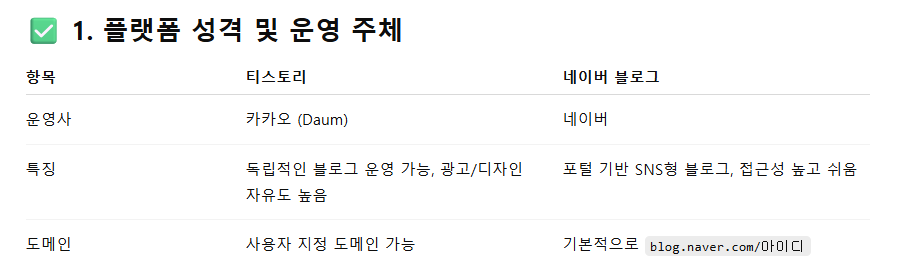 티스토리의 운영사는 카카오 (Daum), 네이버 블로그는 네이버기반 입니다. 이에 대한 특징은 티스토리는 광고를 위한 목적이 크고, 네이버는 포털 기반의 sns형이라 일상을 다루기 좋고 접근이 쉽지만 광고 단가가 낮다고 생각하시면 되요!