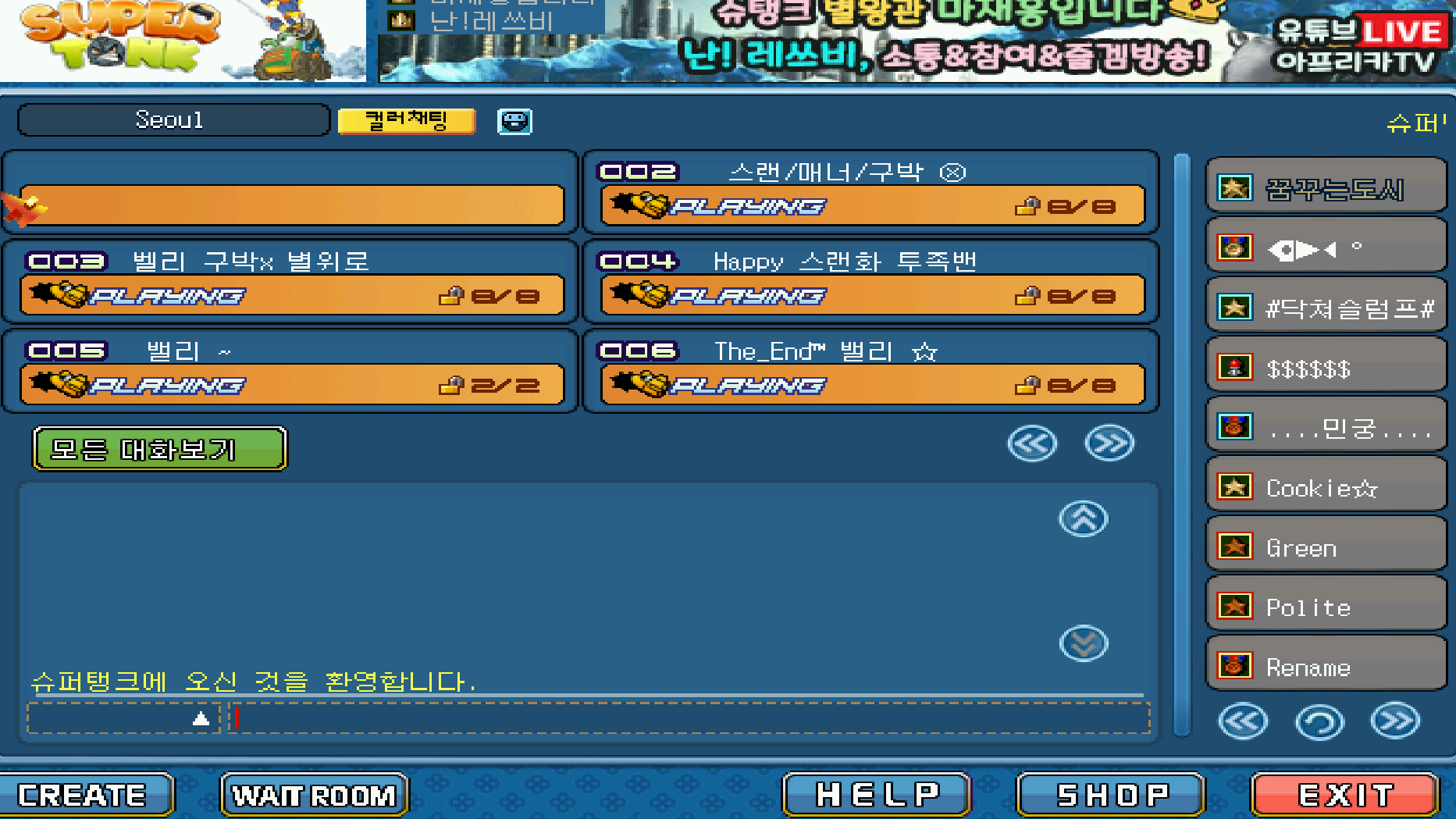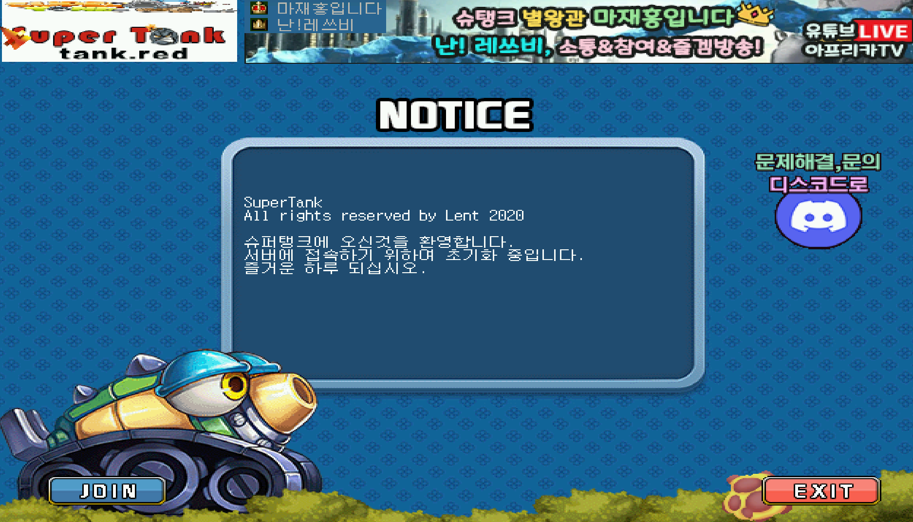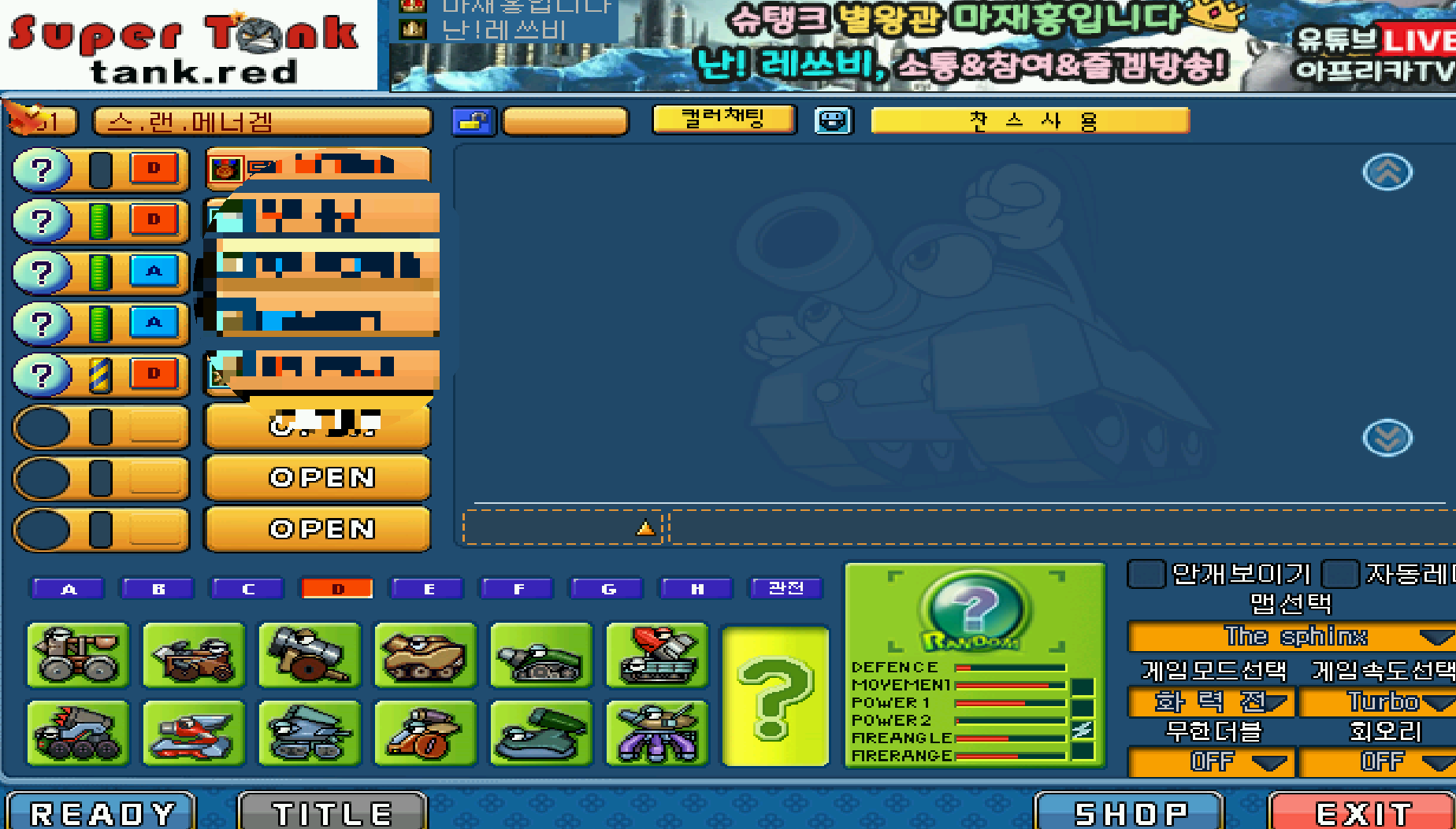 90년대 즐기던 포트리스처럼 반가운 음악과 함께 JOIN, 자신의 계급이 나오고, 방에 들어가면 스핑크스, 스카이, 밸리 등 맵을 선택할 수 있습니다. 탱크를 고르고 레디하면 끝!