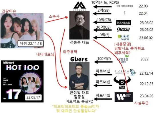 - 소속사 어트랙트(전홍준 대표)와 더기버스(안성일 대표)는 함께 FIFTY FIFTY 팀을 만들었습니다