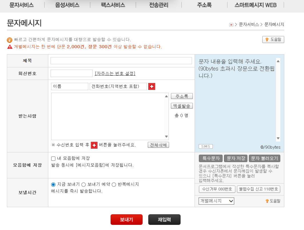 가장 많이 사용하는 문자메시지인데요, 제목에 글을 넣어주고, 회신번호는 받는 상대방에게 받게되는 번호예요. 받는 사람은 주소록에 미리 입력해두면 편하고, 우측에 문자 내용을 입력해서 보내기 버튼을 누르면 끝!